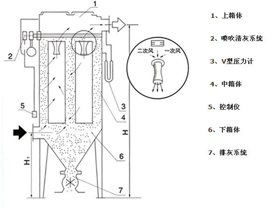 DMC單機除塵器由上、中、下箱體,排灰系統及噴吹系統五部分組成。上箱體包括可掀的蓋板和出風口;中箱體內有多孔板、除塵器骨架、除塵器濾袋及文丘里管;下箱體由灰斗、進風口及檢查門組成;噴吹系統包括控制閥、脈沖電磁閥、噴吹管和氣包。